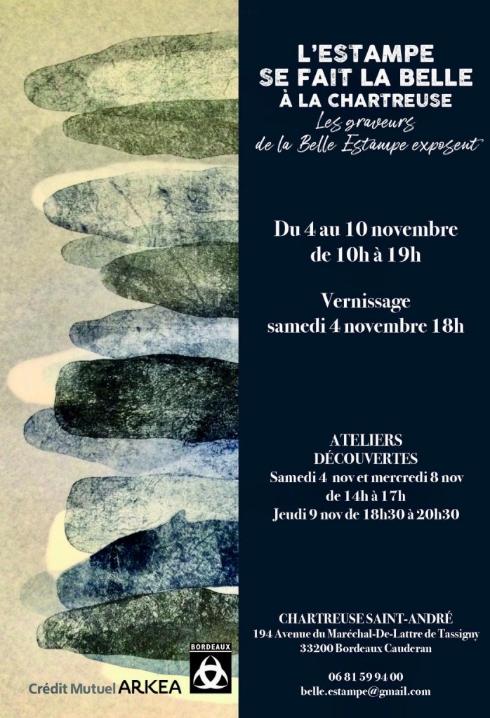 La prochaine exposition aura lieu à Cauderan à la Chartreuse Saint André, ( ligne 3 – arrêt Saint Amamt ) 194 avenue du Maréchal de Lattre de Tassigny, du 4 novembre au 10 novembre 2023 de 10 à 19 heures.