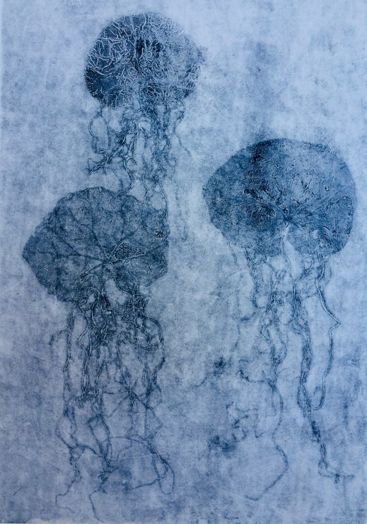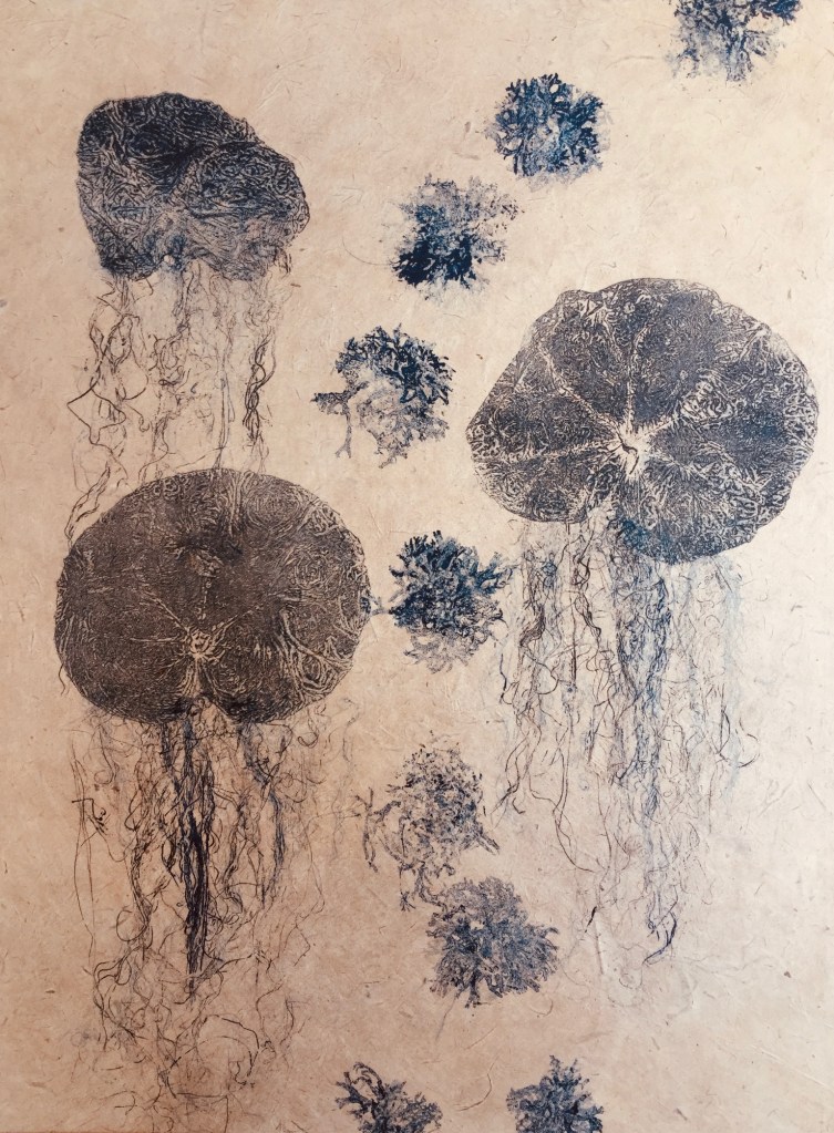 LE LANGAGE DES MÉDUSES 1 – Collagraphie sur papier Japonais – Format 40 x 50 cm – 2020 – Monotype