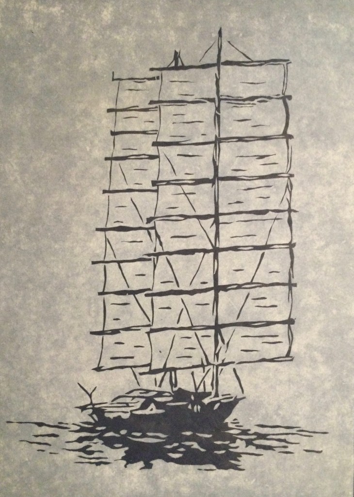 DOUBLE VOILURES AU GRAND LARGUE – Linogravure sur papier Népalais – Format: 40 x 50 cm – 2021 – Nombre de tirage: 60
