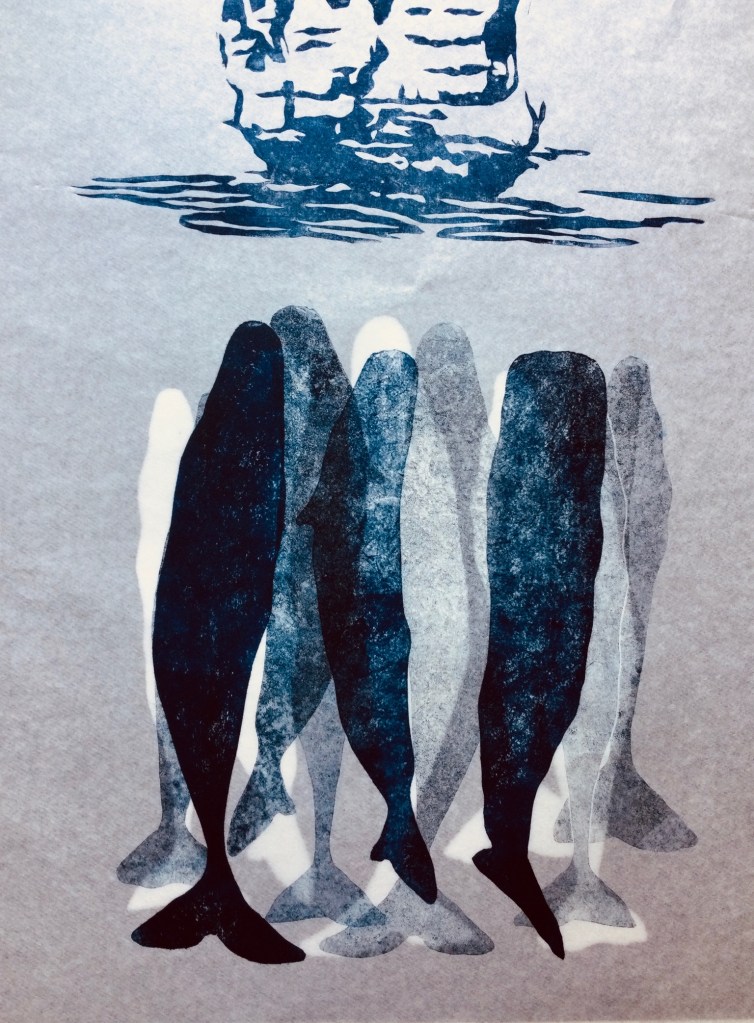 LA PASSE DES CACHALOTS 1 – Linogravure et Collagraphie sur papier Japonais – Format 40 x 50 cm – 2021 – Monotype