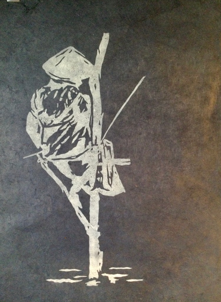 LES SENTINELLES DES EAUX REMONTANTES – Linogravure sur papier Népalais – Format: 40 x 50 cm – 2021 – Nombre de tirage: 60