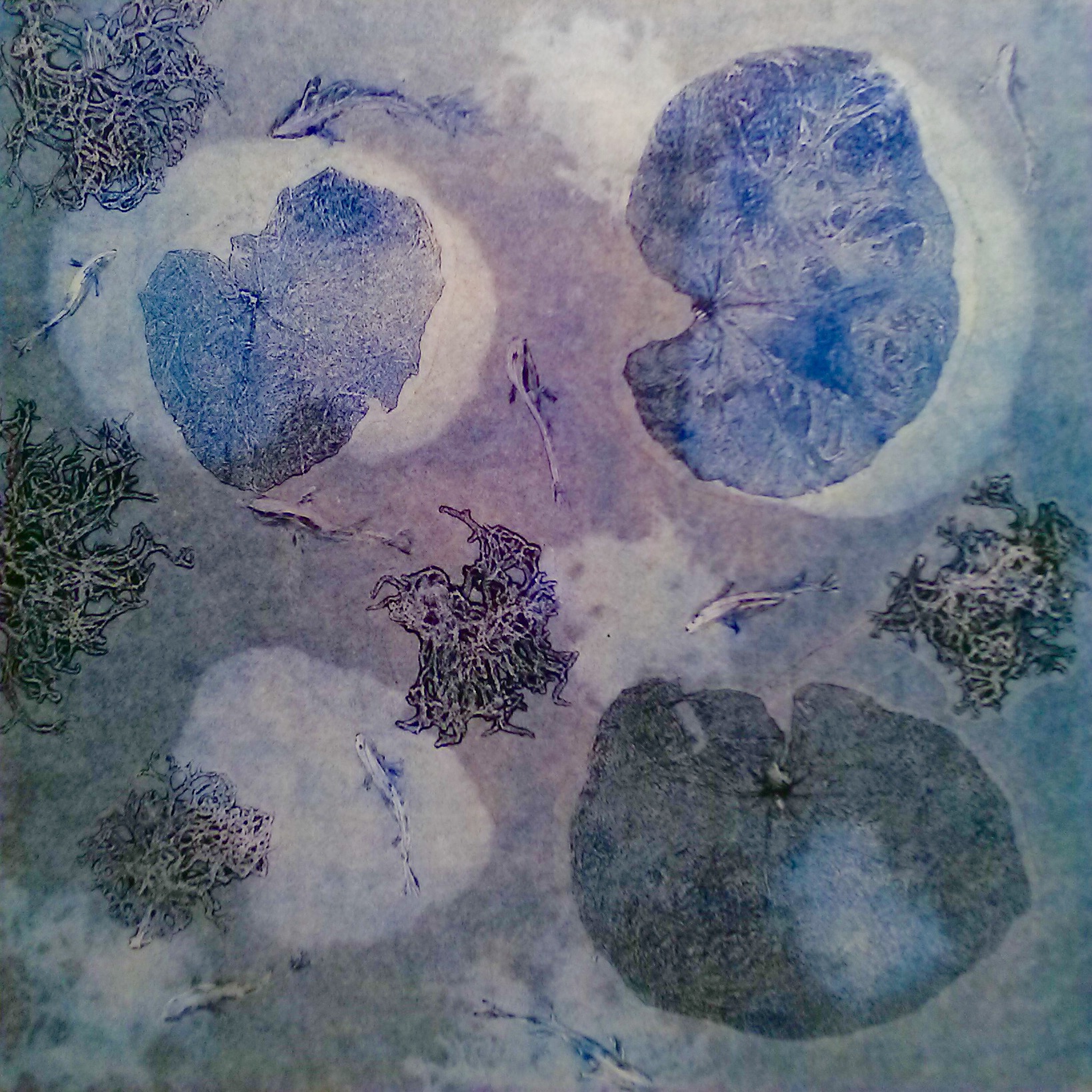 SOUS LES EAUX – Collagraphie sur papier de soie – Format 40 X 40 cm – 2020 – Monotype